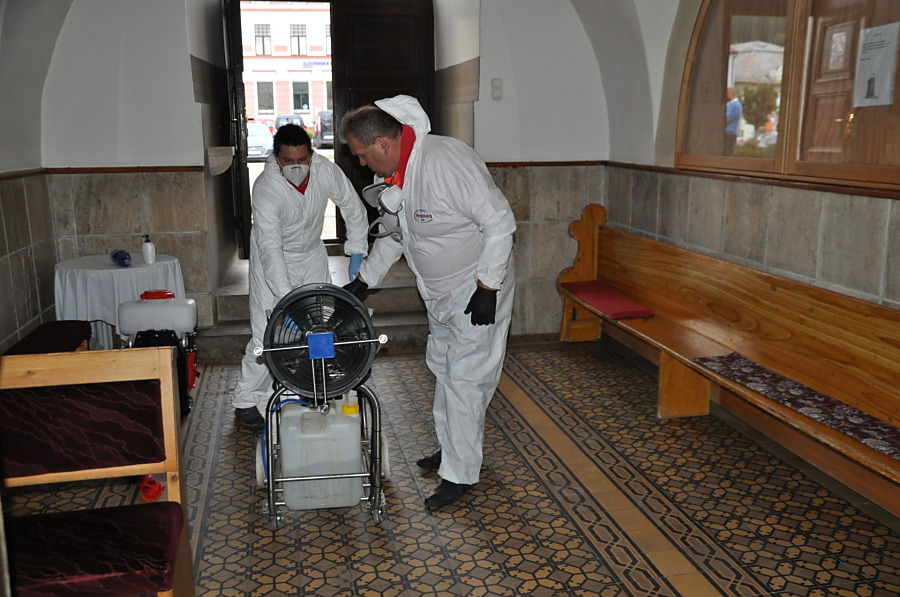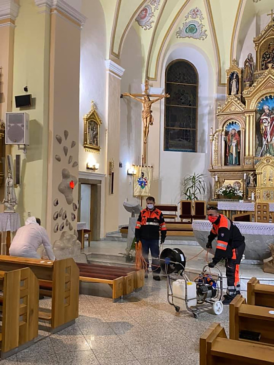 TRSTENÁ. Primátorka Trstenej Magdaléna Zmarzláková nás požiadala o pomoc pri dezinfekcii františkánskeho kostola sv. Juraja, pretože traja rehoľní bratia z rehole Františkánov majú potrdený koornavírus. Okrem kostola sme včera roztokom peroxidu vodíka a ozónom vydezinfikovali aj kláštor, v ktorom bývajú.