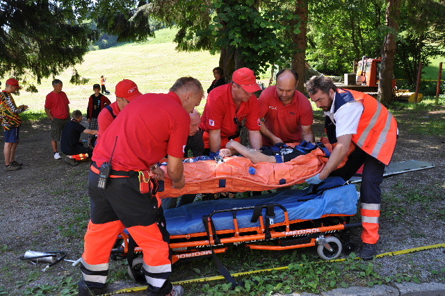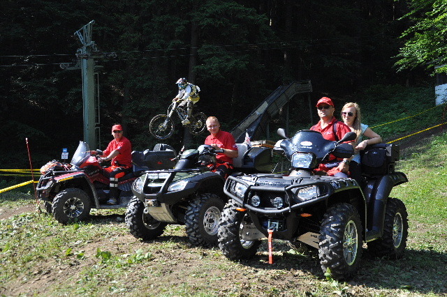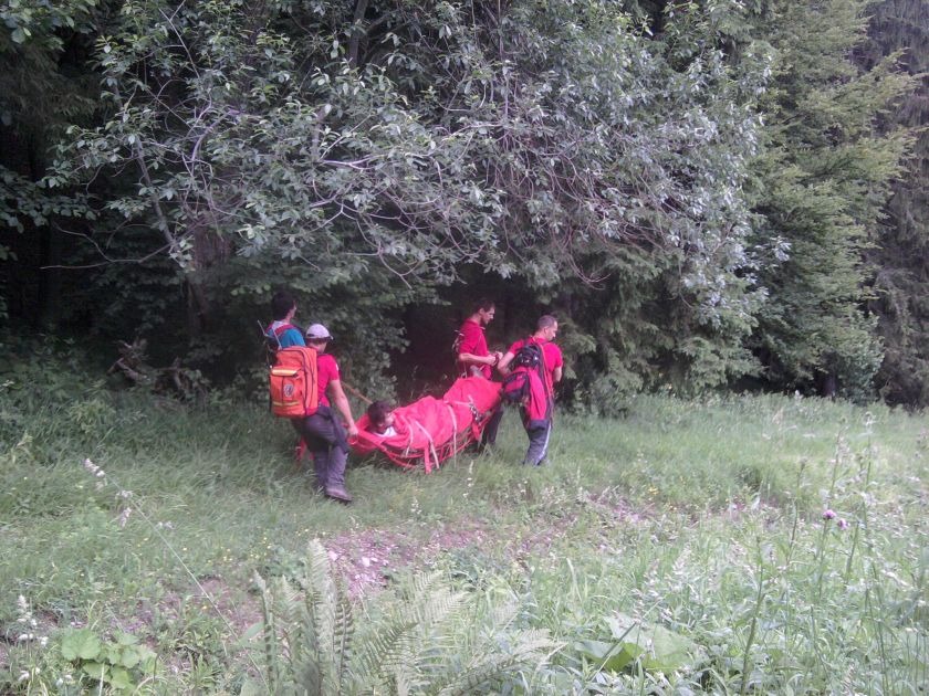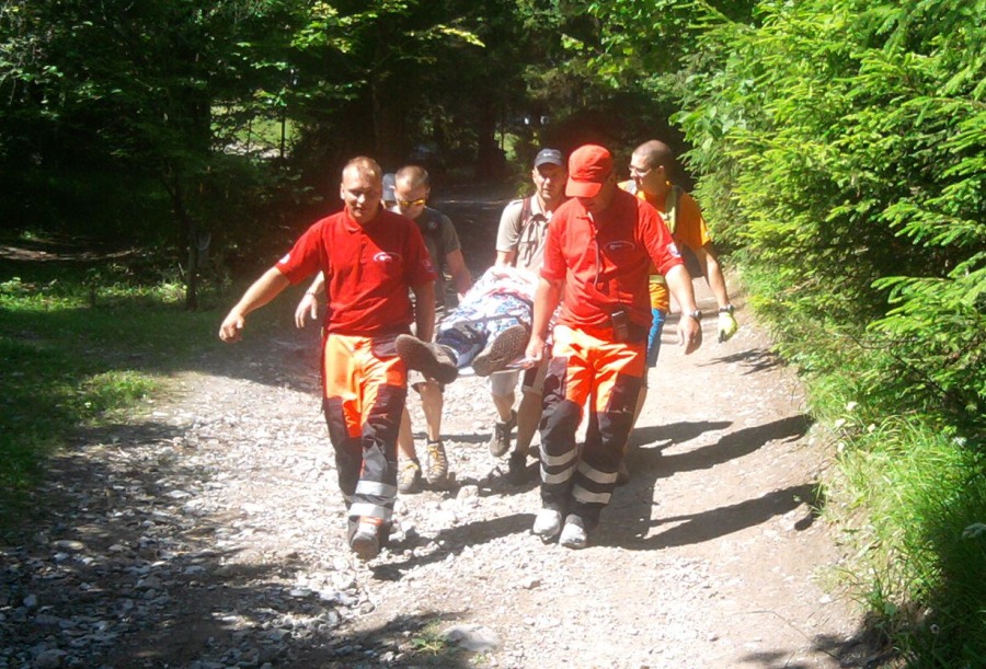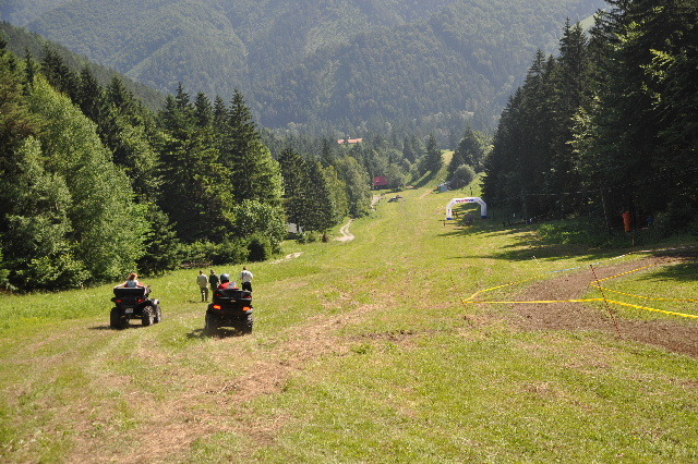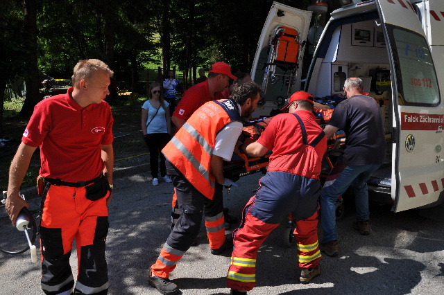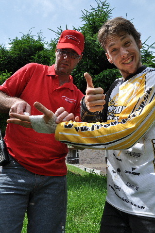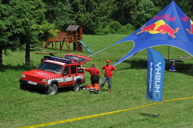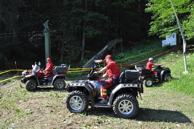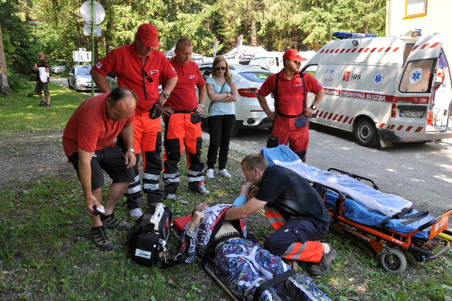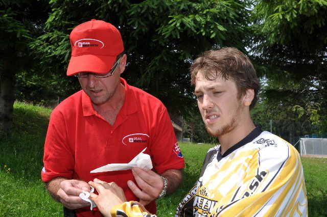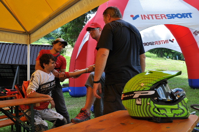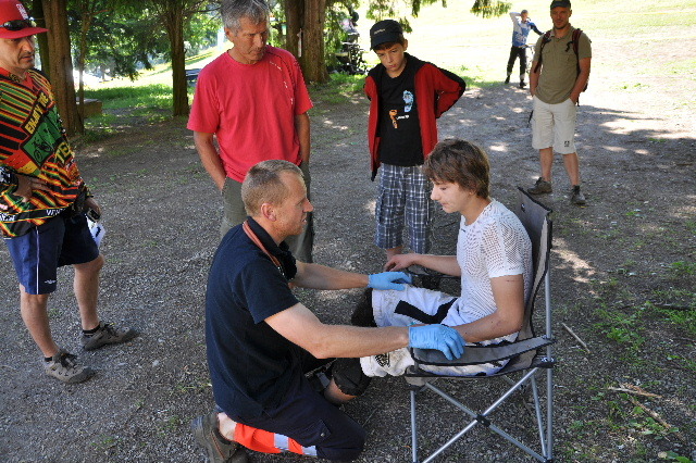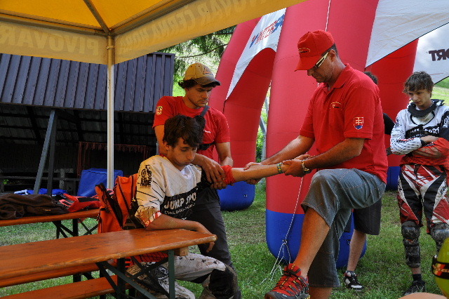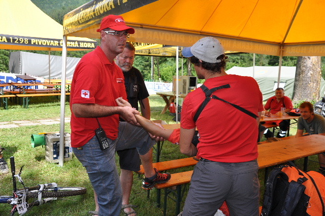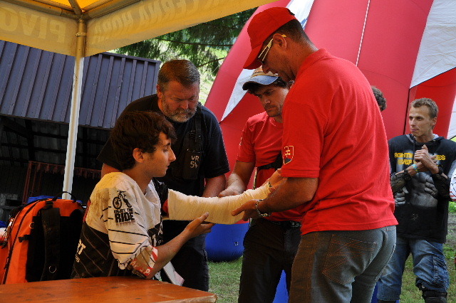 Nedeľa nám dala zabrať viac. Hneď ráno ostal nehybne ležať pod jedným zo skokov mladý Čech. Mal veľké bolesti, ťažko dýchal. S podozrením na zlomenú chrbticu sme ho opatrne naložili na nosidlá a preniesli ku hotelu, kde po neho prišla sanitka. Vyšetrenie v nemocnici potvrdilo zlomenie hrudného stavca, miecha však našťastie nebola poškodená. Medzitým utrpel ďalší jazdec otras mozgu a ďalší prišiel o necht na palci ruky. Popoludní horskí záchranári naložili na vlek cyklistu s vykĺbeným ramenom a to nepočítame ďalšie drobné odreniny, na ktoré stačila dezinfekcia.