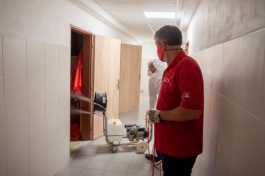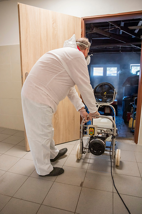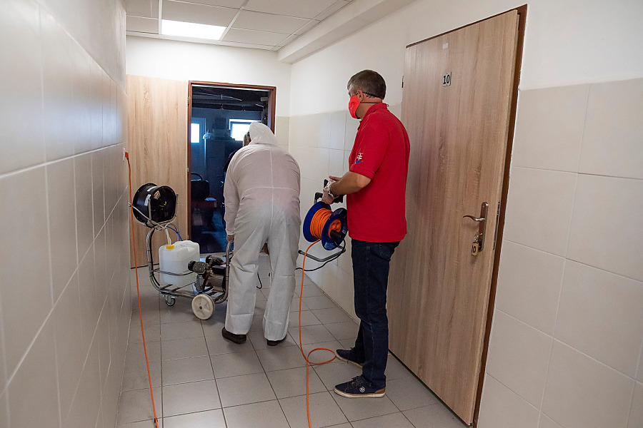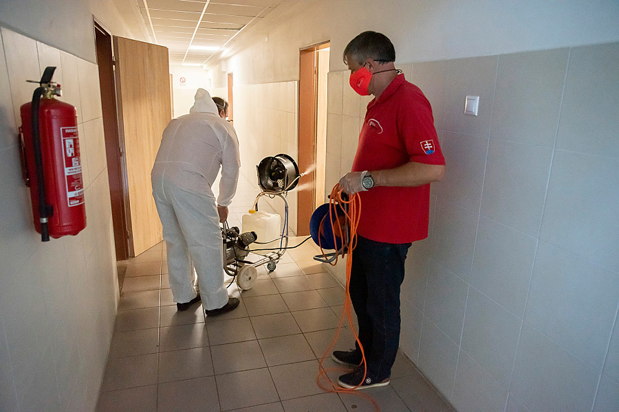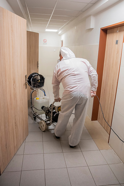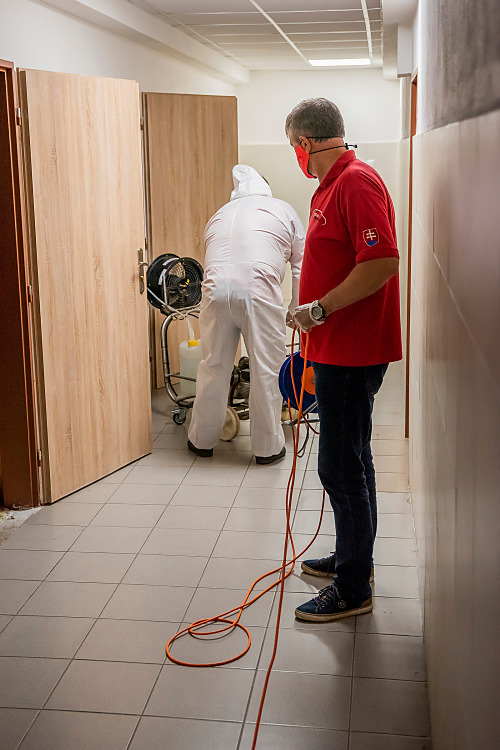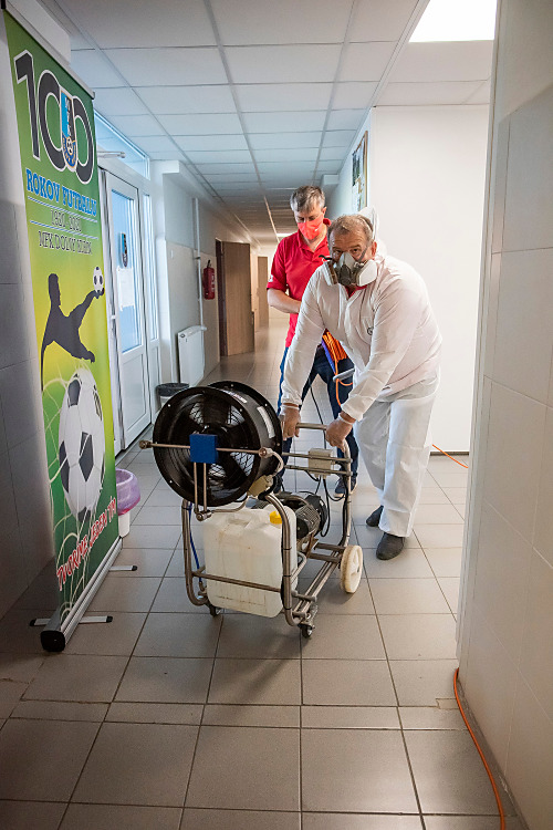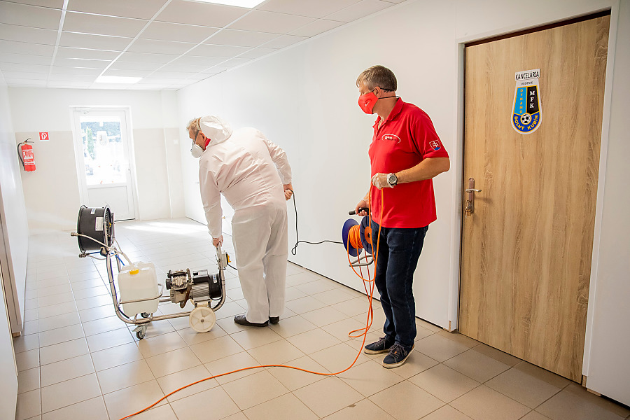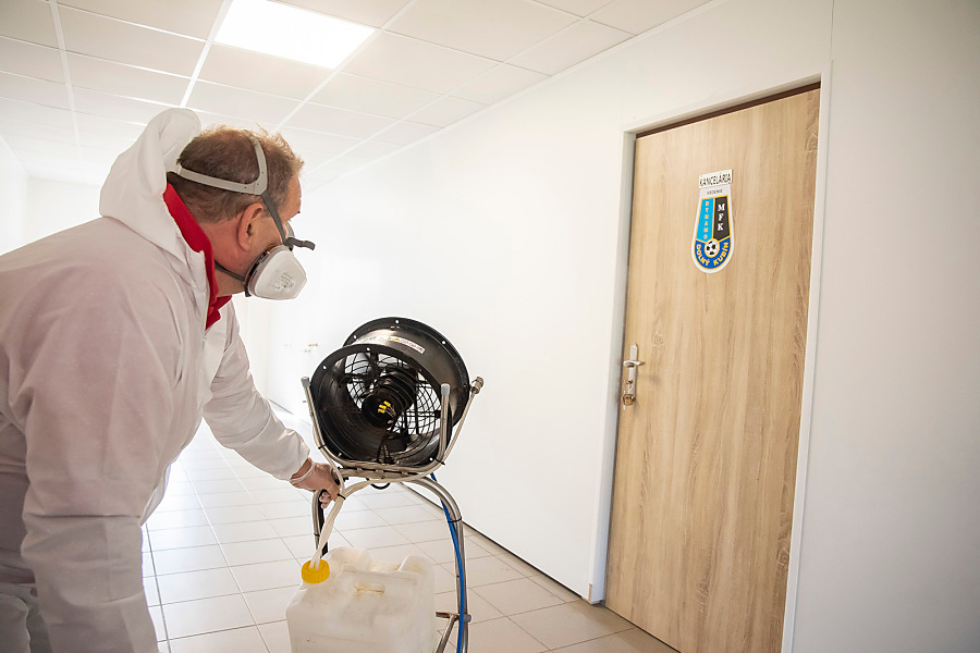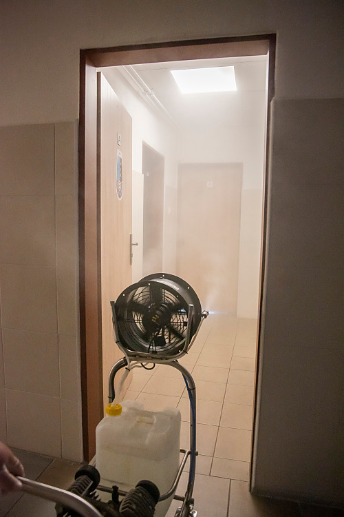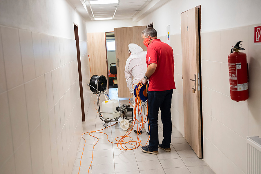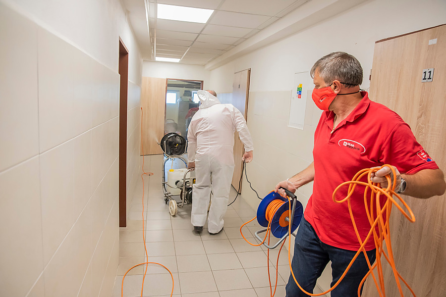Pri niekoľkohodinovej dezinfekcii sme v menších uzatvorených priestoroch využili svedčený ozón, ktorý likviduje až 99 percent baktŕií, vírusov, plesní a iných patogénov. Vo väčších priestoroch sme aplikovali roztk peroxidu vodíka.