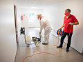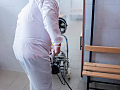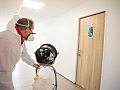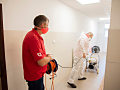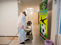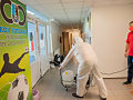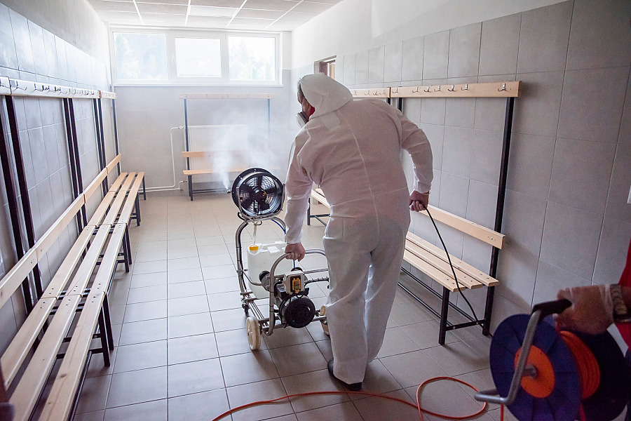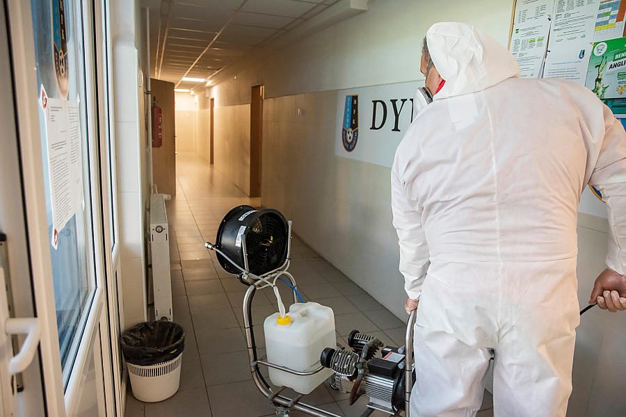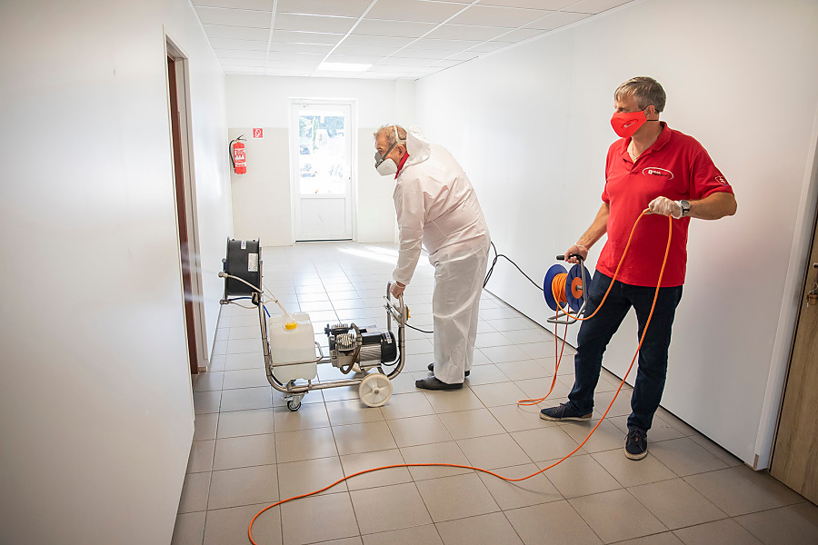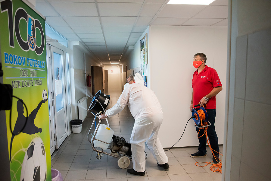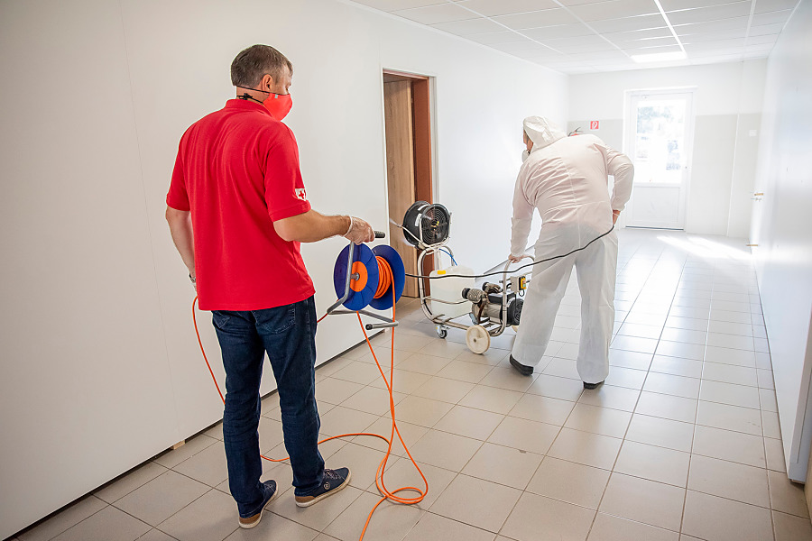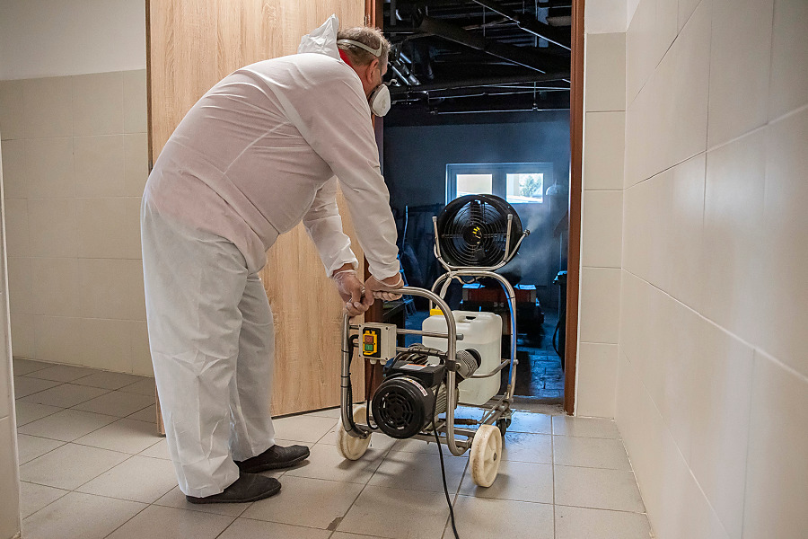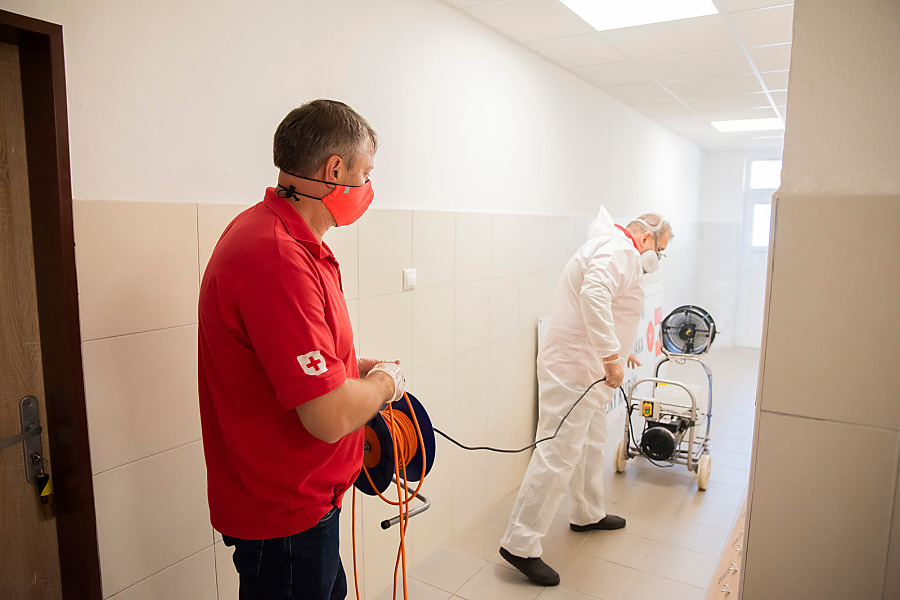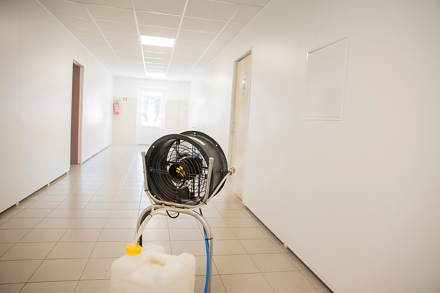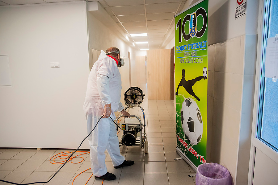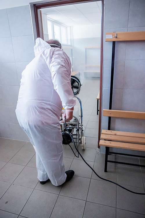 Pri niekoľkohodinovej dezinfekcii sme v menších uzatvorených priestoroch využili svedčený ozón, ktorý likviduje až 99 percent baktŕií, vírusov, plesní a iných patogénov. Vo väčších priestoroch sme aplikovali roztk peroxidu vodíka.
