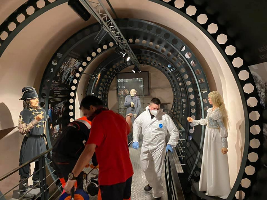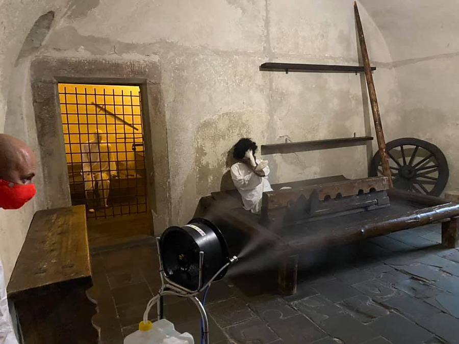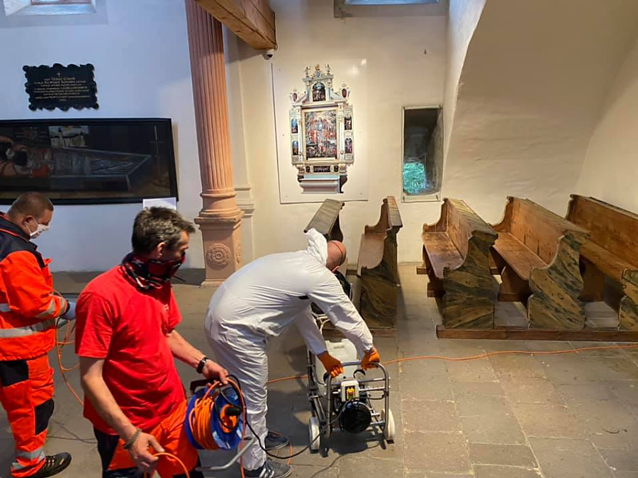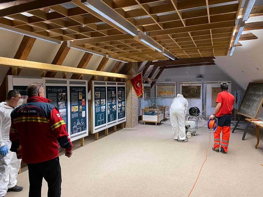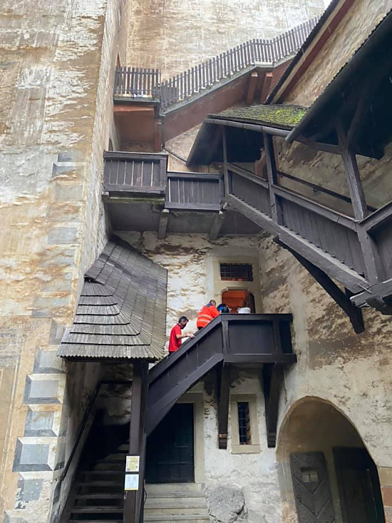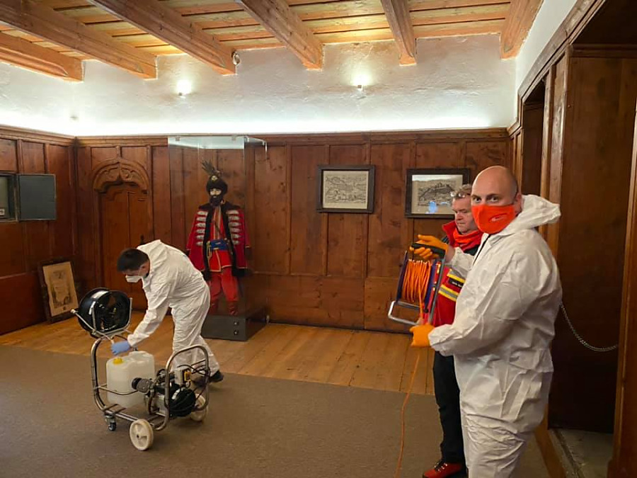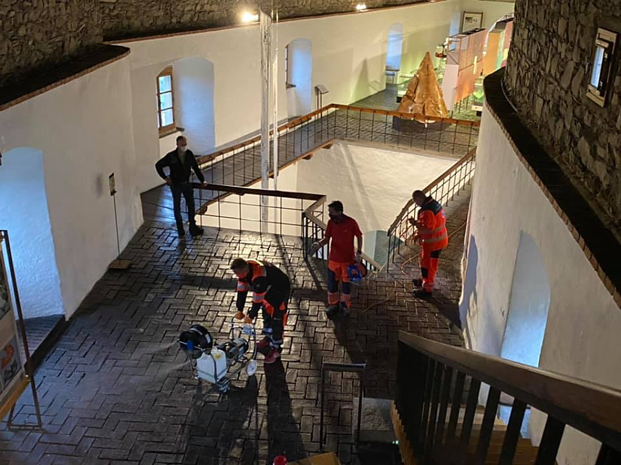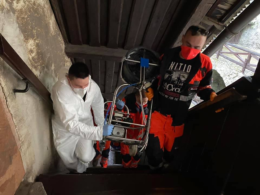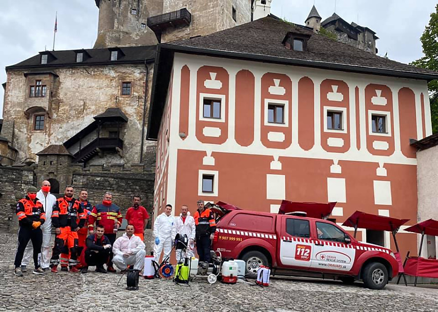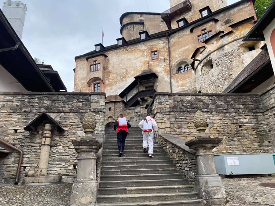 ORAVSKÝ PODZÁMOK. Pokračovali sme v dezinfekcií zariadení, ktorých zriaďoovateľom je Žilinská župa. Tentoraz ná o pomoc požiadala riaditeľka Oravského hradu. Táto úloha bolo oproti dezinfikovaniu nemocníc a polikliník oveľa náročnejšia, pretože na hrade je viac ako šesťsto schodov. zariadenia sme museli všade prenášať, čo bolo fyzický náročné, hlavne výstup na citadelu do výšky približne sto metrov nad hladinu rieky Orava.