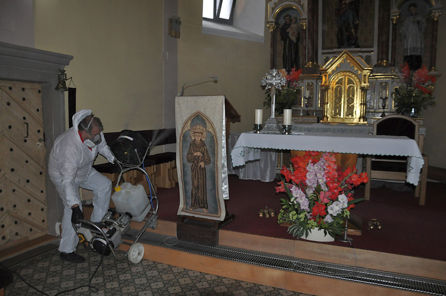 TRSTENÁ. Primátorka Trstenej Magdaléna Zmarzláková nás požiadala o pomoc pri dezinfekcii františkánskeho kostola sv. Juraja, pretože traja rehoľní bratia z rehole Františkánov majú potrdený koornavírus. Okrem kostola sme včera roztokom peroxidu vodíka a ozónom vydezinfikovali aj kláštor, v ktorom bývajú.